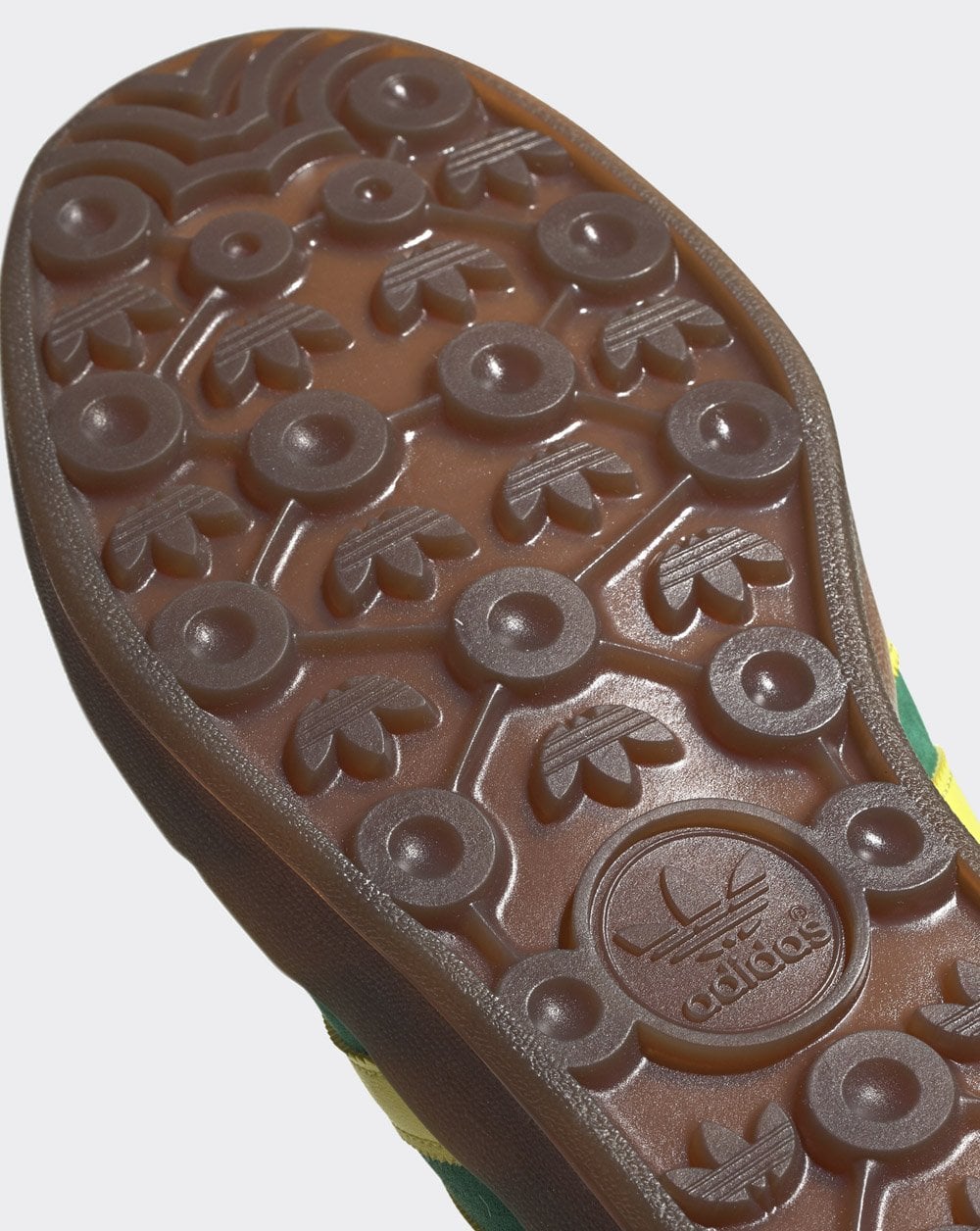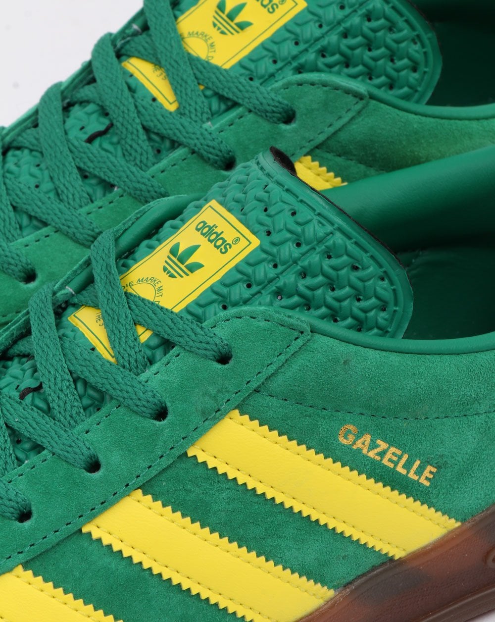 This version of the classic Adidas Gazelle Indoor comes in a Bold Green Suede upper with contrasting Bright Yellow 3 stripe detail and the classic gum sole and suede toe.