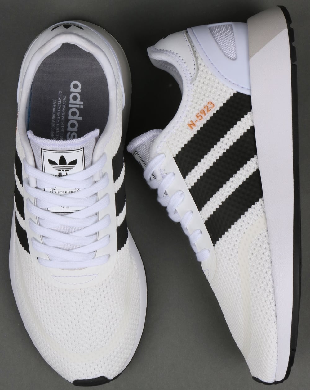 This is the fresh Adidas N-5923 trainer in white with contrasting black 3 stripes. The N-5923 is has taken inspiration from the style of classic 70’s running shoes that had been built to cut through the air. The N-5923 have coupled together the classic retro look with a modern breathable mesh.