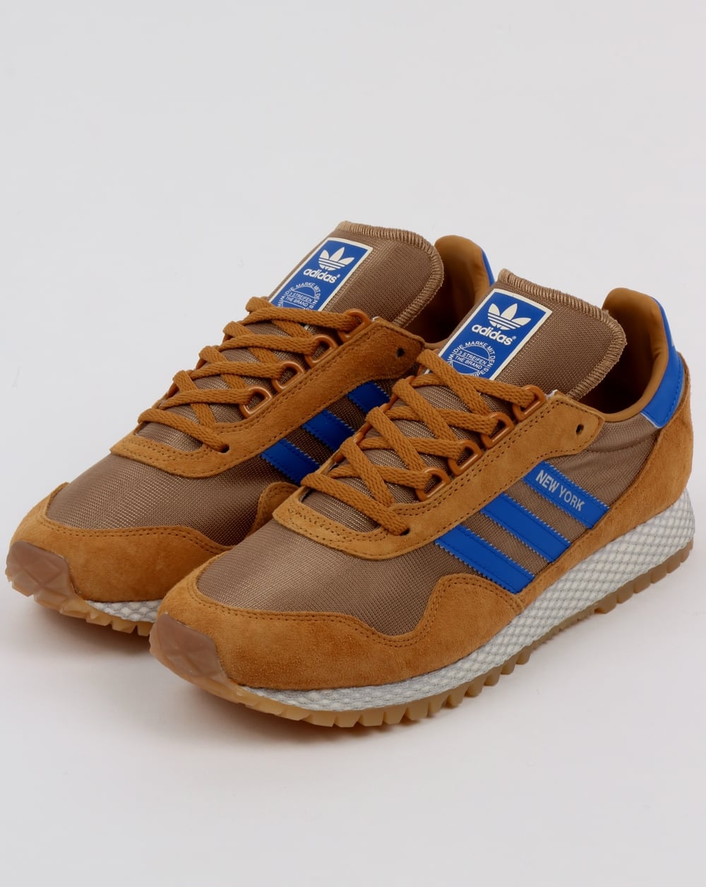 The classic adidas New York is a smart, savvy style brought back from the archives and re-imagined in fresh colour for the old skool trainer collector. These New York trainers feature the classic OG mesh upper in a stunning mesa tan colour with matching nubuck overlays and blue 3 stripe details. Another unique part of the shoe is the iconic web wrapped EVA midsole which keeps true to the adidas New York heritage. A great looking shoe with additional gold details for the "NEW YORK" writing on the sides and heel tab.