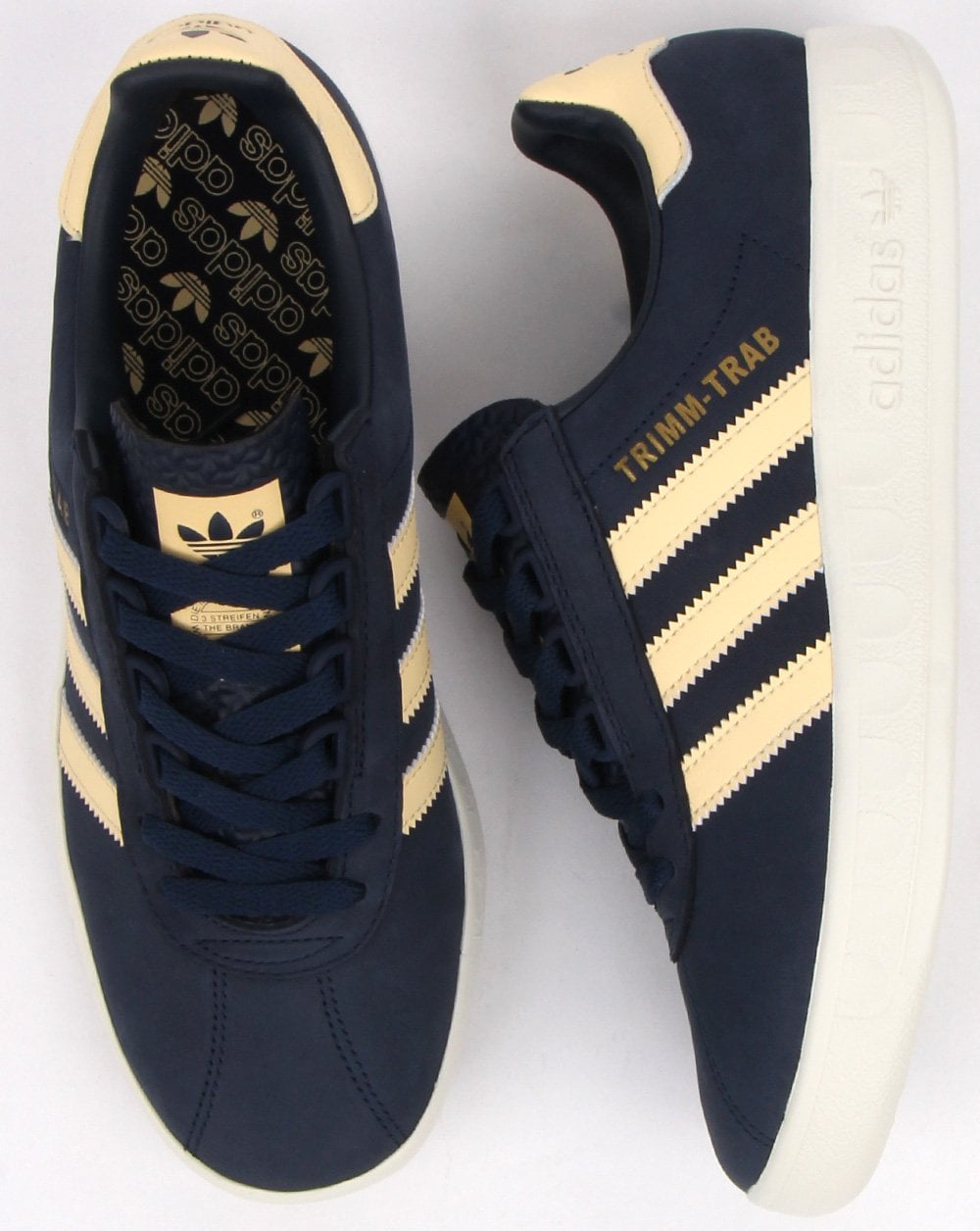 A truly iconic collectors terrace style the Trimm Trab is back in a classic Navy with a soft yellow stripe detail. The casual low-profile style caught the attention of travelling football fans in the '80s and featured in many films and documentaries of the time also became a Blur Brit Pop track in the 90s. These shoes are a reissue of the heritage design. They're made of ultrasoft nubuck and are detailed with a dimpled tongue and gold-foil letters.