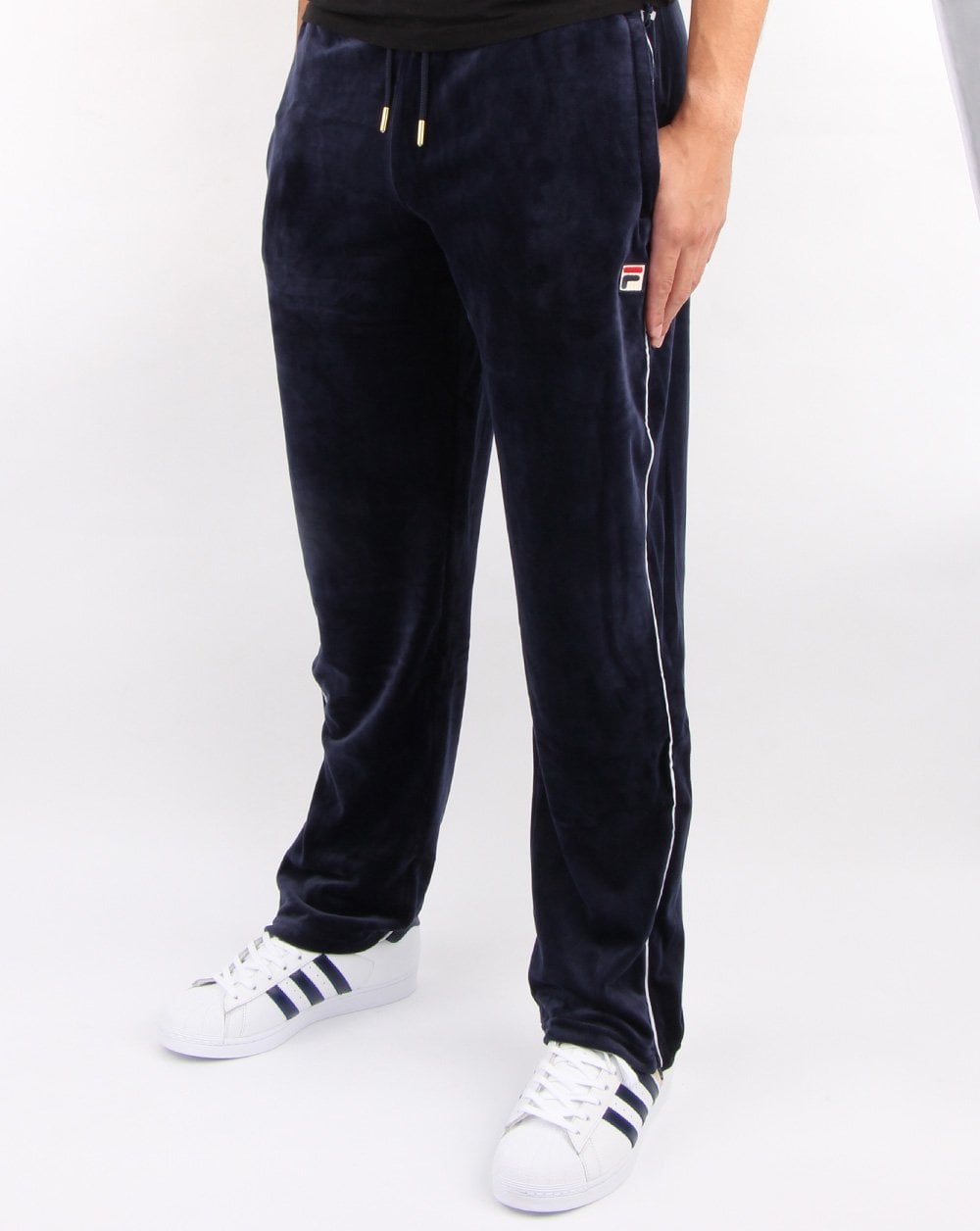 The Fila Cyrus velour tracksuit bottoms are inspired from retro, archives pieces with a unique design that sees a zipped hem that can be zipped up or down according to how you may want to wear these bottoms. Crafted from a fine velour fabric these have real old skool appeal and look with the navy colourway and contrasting white piping details running down each leg. A must have style that is a sure fire winner.