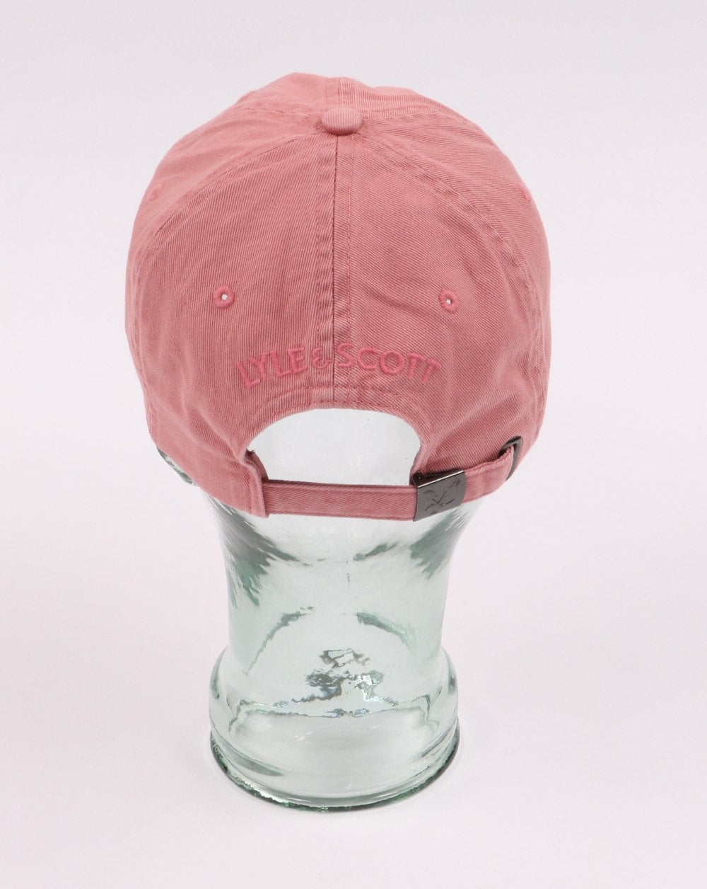 Lyle and Scott Baseball Cap in Pink. Branding features front and centre as well as on the back above the adjustable buckle.