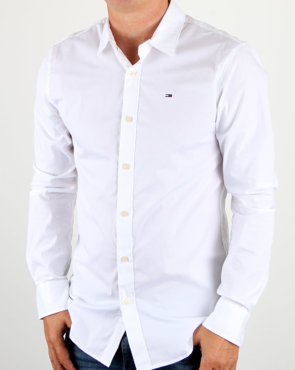 A key choice for a smart occasion and understated looks, the Tommy Hilfiger cotton shirt is a long sleeve piece crafted from 98% cotton 2% elastane for a comfortable fit and feel. The premium cotton poplin blend is a must have for anyone who wants a great fitting shirt. This version in white is perfect with its pearl buttons and the Tommy Hilfiger embroidered logo on the chest to finish.