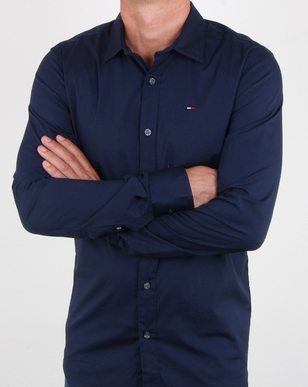 A key choice for a smart occasion and understated looks, the Tommy Hilfiger cotton shirt is a long sleeve piece crafted from 98% cotton 2% elastane for a comfortable fit and feel. The premium cotton poplin blend is a must have for anyone who wants a great fitting shirt. This version in navy blue is ideal with its pearl buttons and the Tommy Hilfiger embroidered logo on the chest to finish that would look good with a pair of jeans and boots.